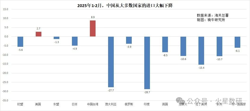 1月至2月,國內產品替代進口產品較困難的美國和中國台灣,我們的進口額同比分別增長了2.7%和8.9%;進口替代較為容易的地區,進口額均大幅下降。比如從印度進口下降了28.7%,從拉丁美洲進口下降了15.4%,從非洲進口下降了10.7%,從一帶一路國家進口平均下降了6.1%。