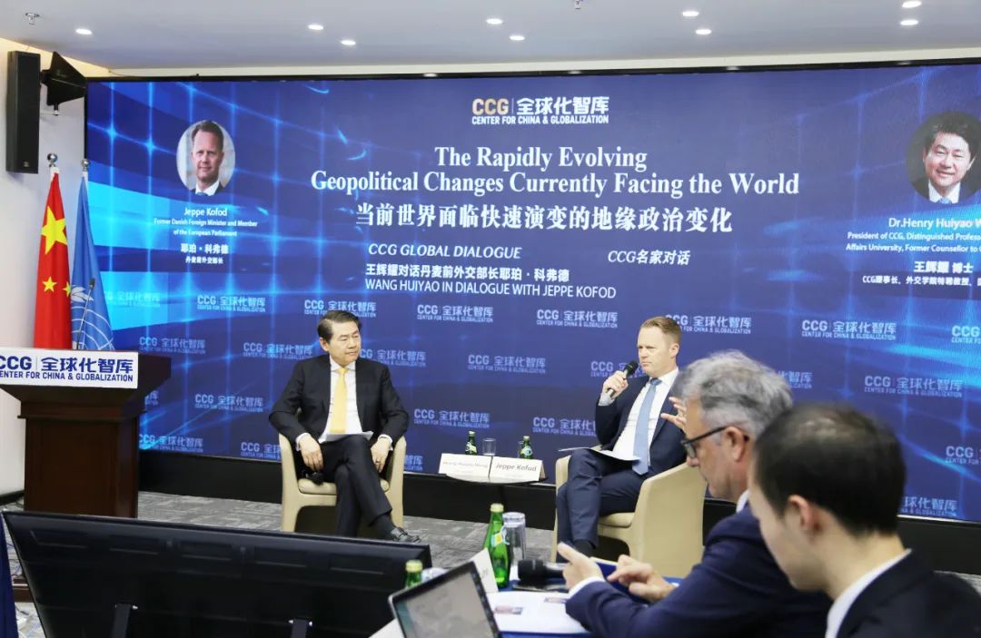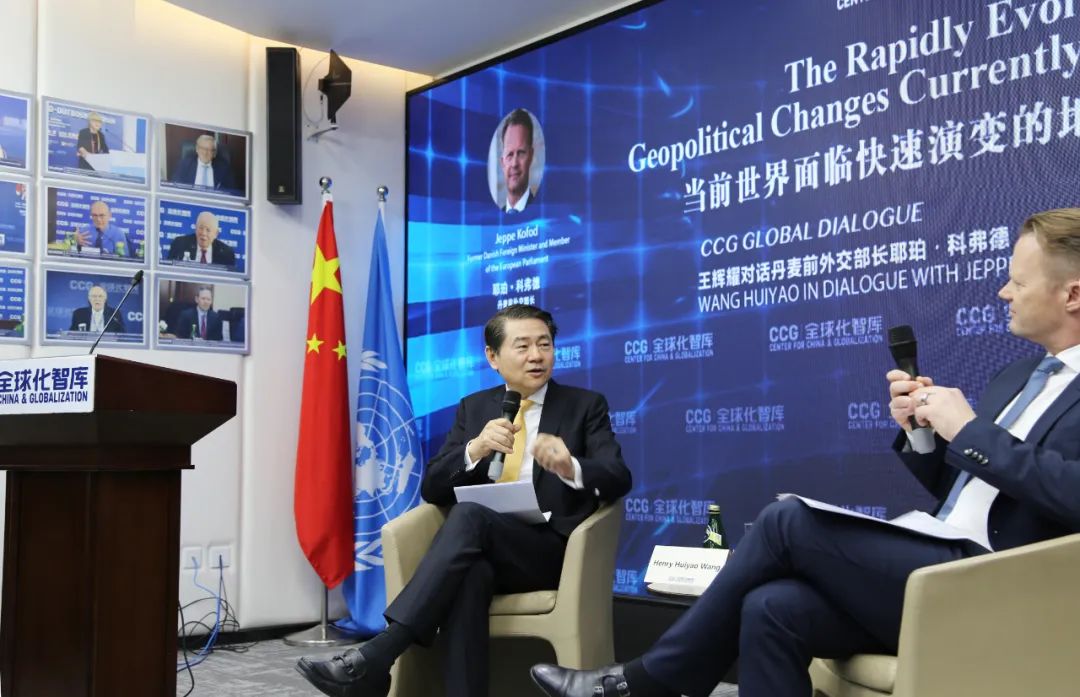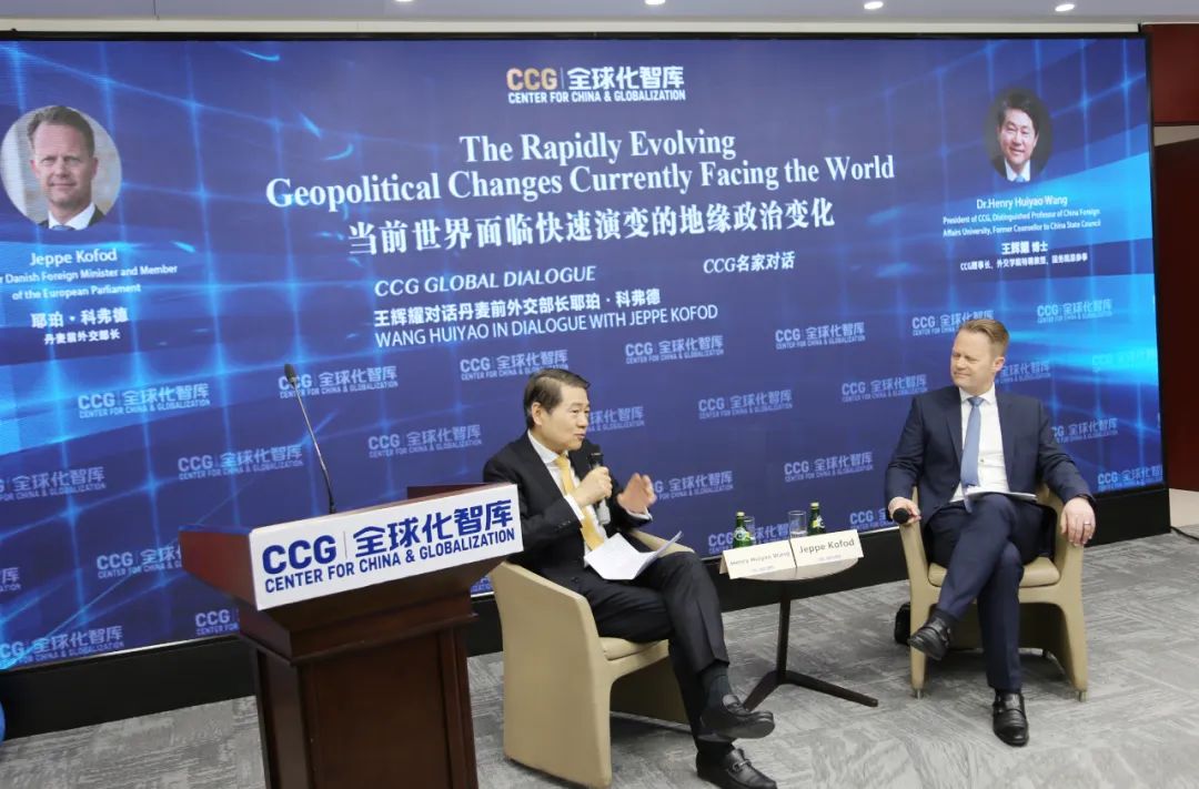 在對話環節,CCG理事長、外交學院特聘教授、國務院原參事王輝耀與丹麥前外交大臣、歐洲議會議員耶珀·科弗德圍繞當前國際形勢、中歐關係現狀與前景等多個熱點話題展開討論。
