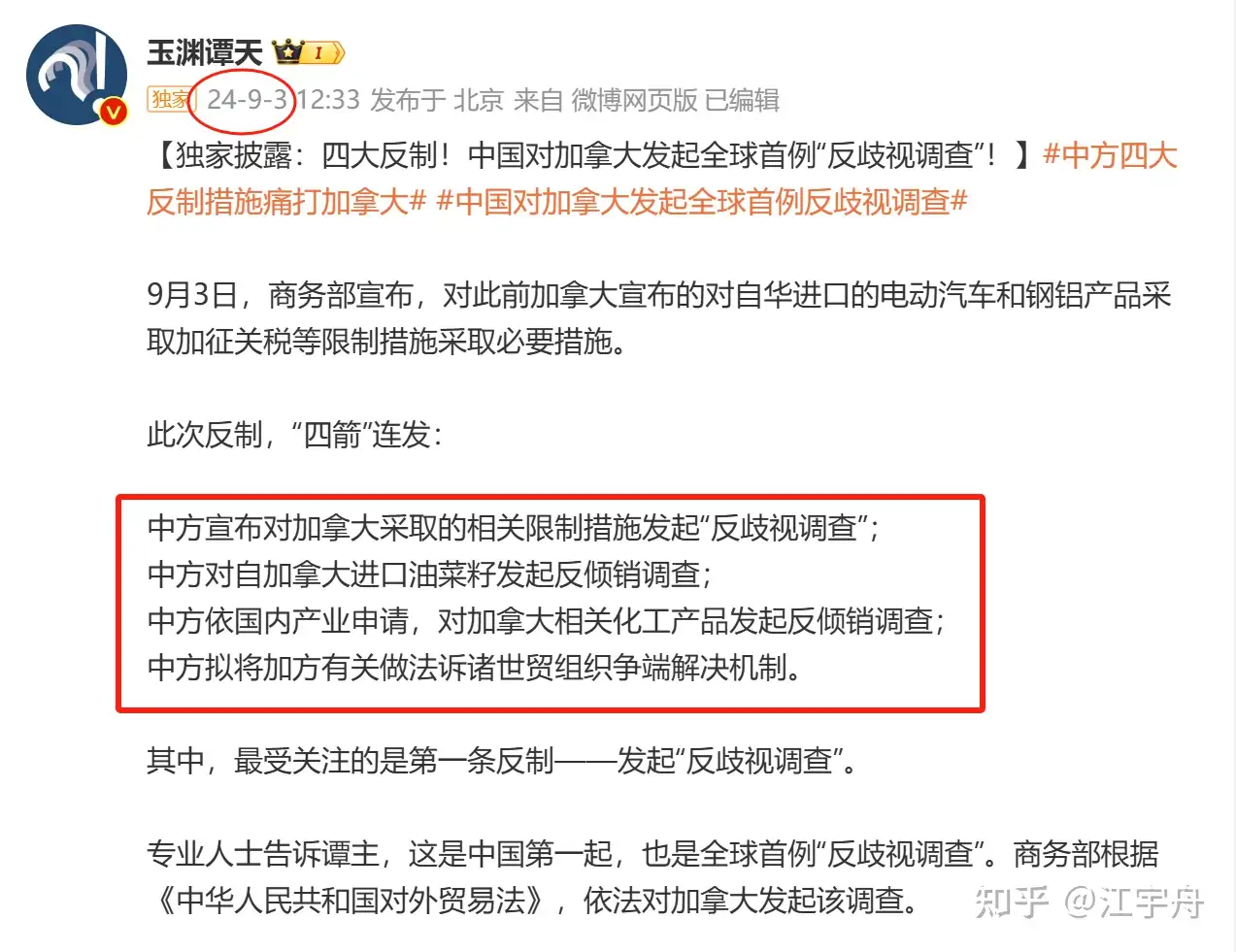 它不是新聞,而是舊聞的延續。早在去年9月,商務部就宣佈,對此前加拿大宣佈的對自華進口的電動汽車和鋼鋁產品採取加徵關税等限制措施採取必要措施。當時就有央媒發過解讀文章[1],如今是經過半年調查,靴子終於落地。