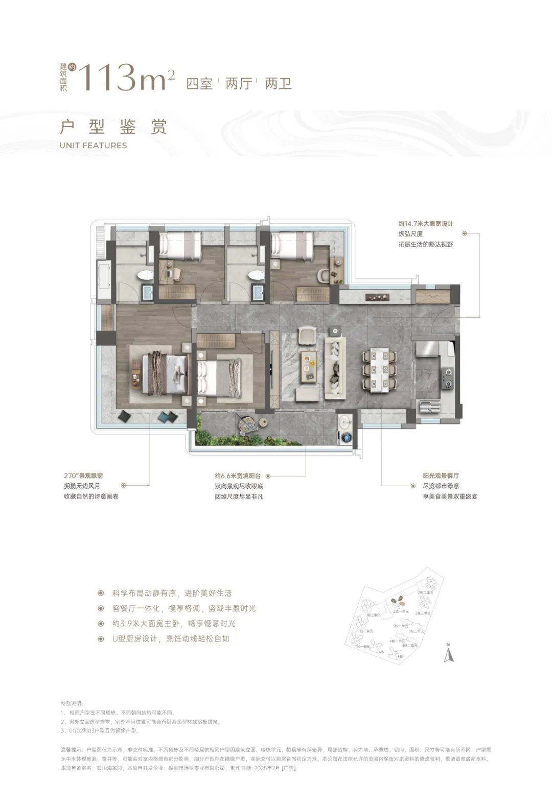 最大面寬達到約14.7米,寬境陽台最大約6.6米,可以説最大限度延展了採光和景觀面。