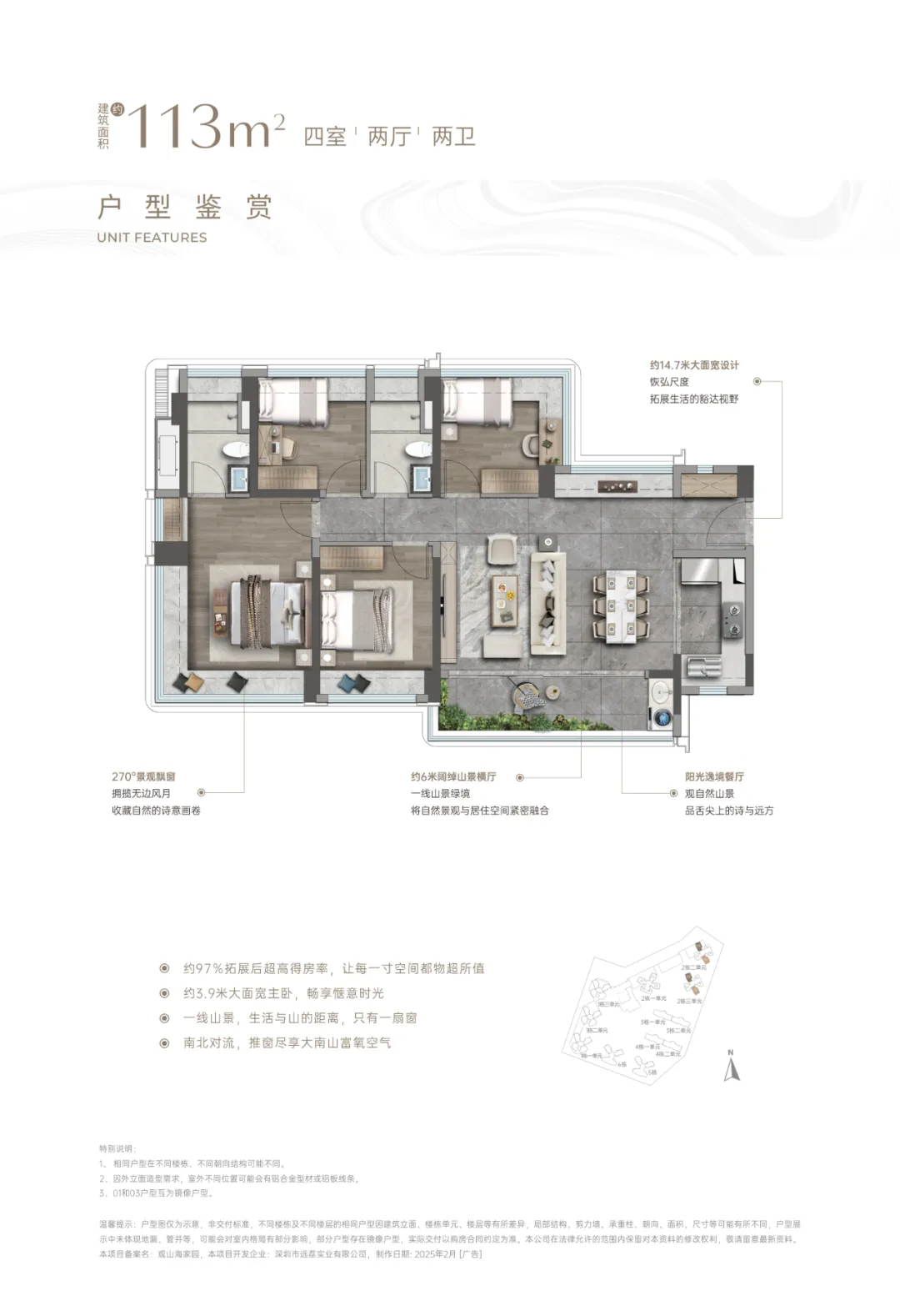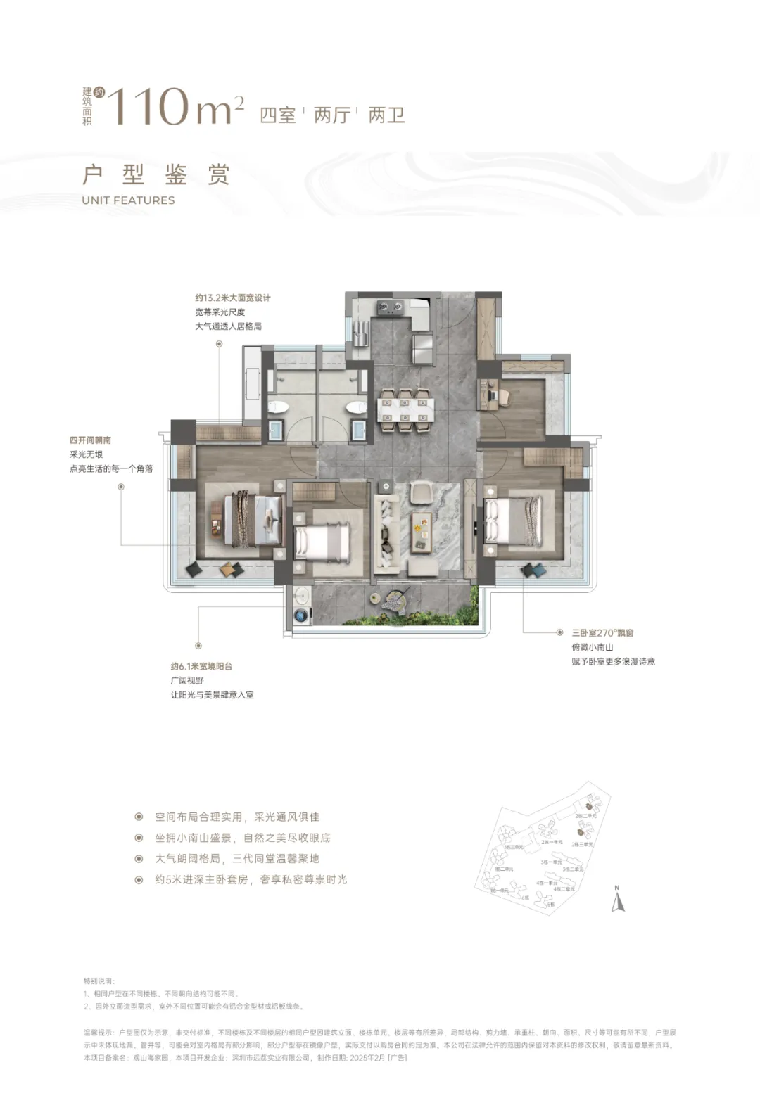 主次卧空間尺度進一步升級,主卧套房及一個次卧都有270°轉角大飄窗。