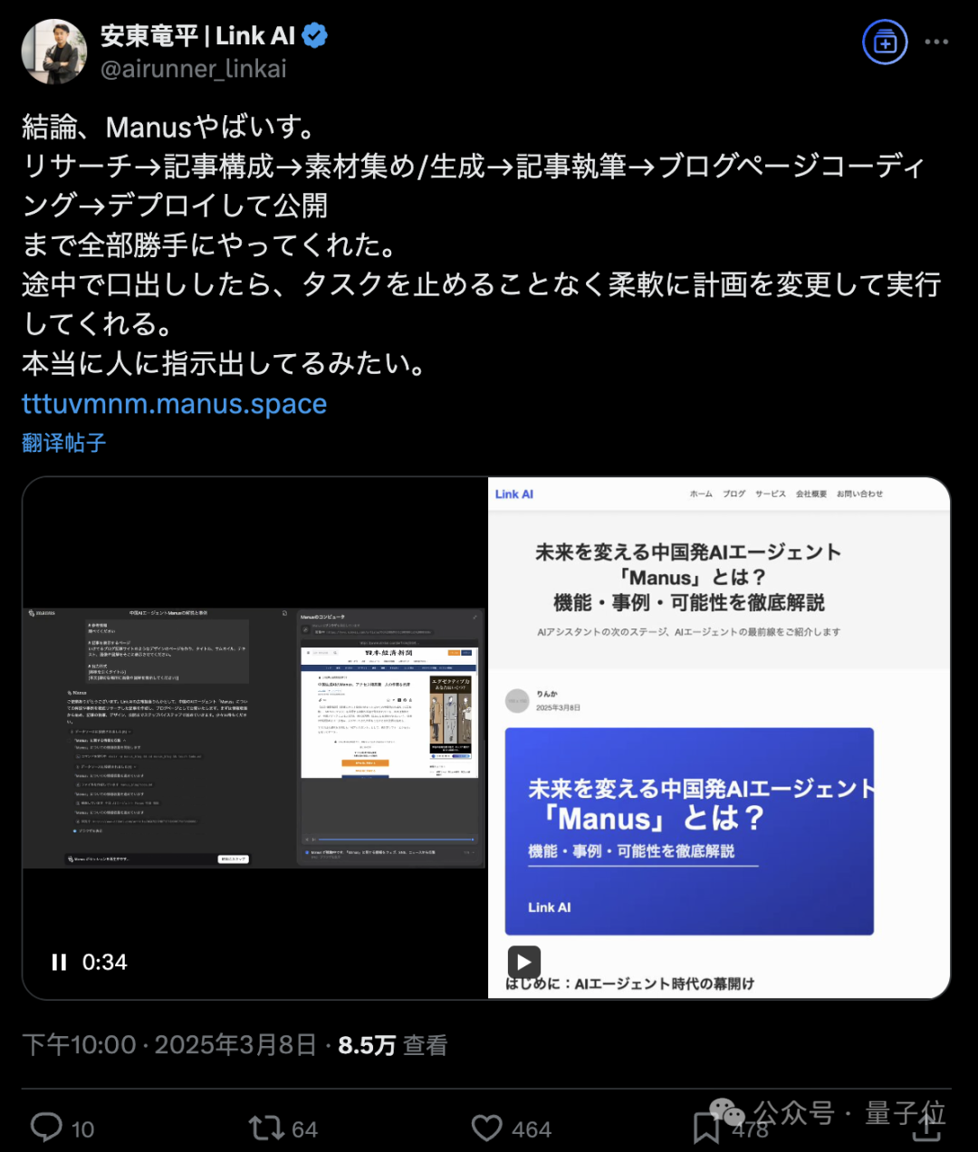 類似的任務還有日本網友讓Manus部署一個介紹他自己的網站。