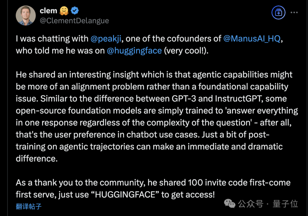 除了給海外大V單獨發之外,Manus聯創季逸超還與抱抱臉CEO取得聯繫,公開分享100個碼,見者有份,先到先得。
