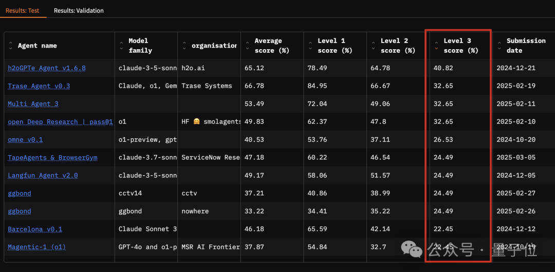 此外GAIA排行榜分為測試集(Test)和驗證集(Validation)兩項,其中驗證集是公開數據,測試集為私有數據,測試集的含金量更高一些。
