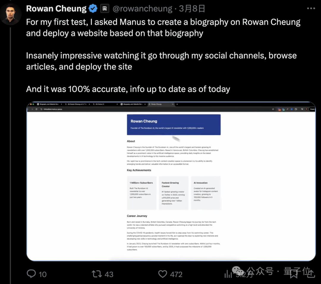 其中Rowan Cheung表示Manus收集到關於他的個人信息100%準確且是最新的。