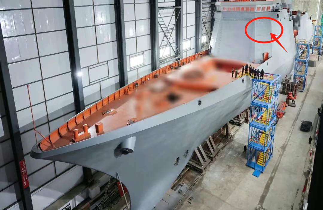 首先是位於艦橋上的相控陣雷達安裝位置已經被封閉上了。當然,這並不意味着相控陣雷達已經裝艦。畢竟作為安裝精度要求極高的艦載設備,相控陣雷達一般需要等待艦體下水之後,在水中進行充分的應力釋放後,才能開始安裝。現在只是暫時用一塊蒙皮把相控陣雷達安裝部位掩蓋起來,以避免其後台已經安裝的伺服系統等受水汽、鹽霧等影響。這也是該艦距離下水更近一步的一個特徵。