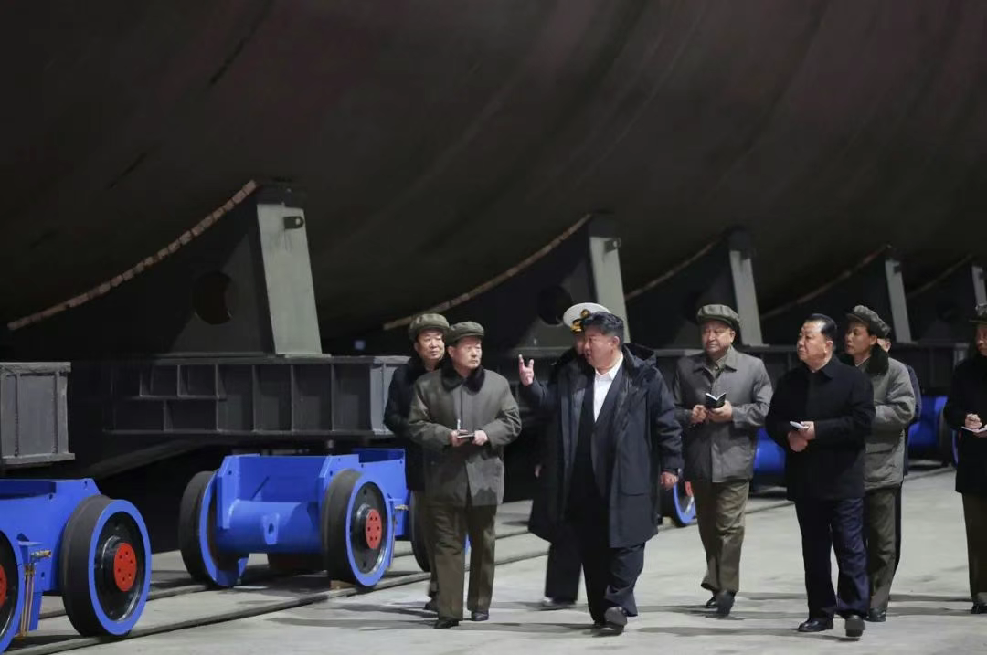 除了檢查該型防空艦的建造,朝中社特別提出,朝鮮領導人金正恩隨後還檢查了朝鮮核動力戰略導彈潛艇的建造工作,甚至還專門配了一張新聞圖片。圖片中,金正恩正走過一段室內船台,而在他和隨同的工作人員背後,則是一條“大黑魚”,可以清楚地看到潛艇的圓柱狀艇體。