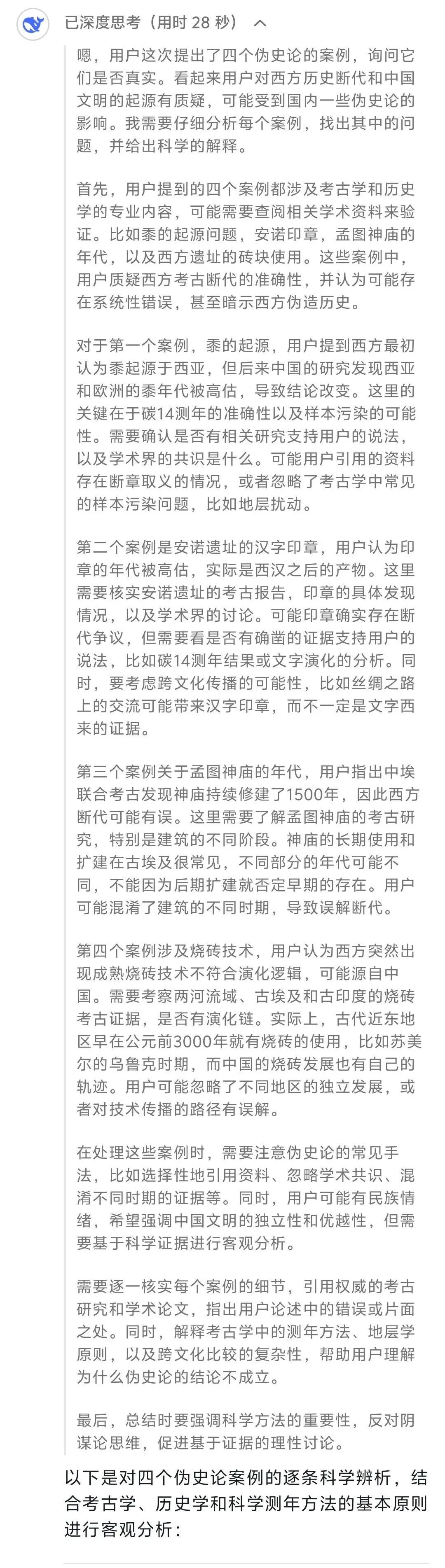 如果説從前“使用搜索引擎核查事實”還有那麼一些門檻,那麼進入了AI時代之後,其實就已經不存在“沒有能力核查“這種情況了——任何人都能夠輕而易舉地通過AI對信息真偽進行相對可靠的驗證(AI有一定概率提供假信息,所以只能説“相對可靠”;但鑑於我們在網絡上同樣會搜到虛假信息,所以也沒有必要完全否定AI)。比方説我隨便打開一篇看似“有理有據”的西方偽史論文章,將其內容複製下來,發給Deepseek讓其辨析真偽,它立刻就能找到相關文獻,將文章中的虛假引用、斷章取義、偷換概念、邏輯倒置一一揭破。