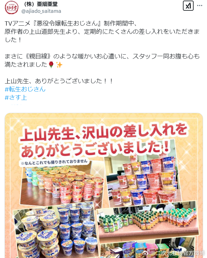 前不久,為了讓動畫組的年輕人們好好吃飯,上山道郎還他們寄了一大堆零食慰問品。這簡直和他筆下,為了讓安娜不要減肥而説出“看到安娜吃飯的樣子會感到幸福”的憲三郎大叔,如出一轍。