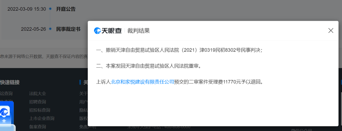 2022年5月26日,天津市中級人民法院給出二審裁定結果,撤銷一審天津自由貿易試驗區人民法院(2021)津0319民初8302號民事判決,發回天津自由貿易試驗區人民法院重審,上訴人北京和家悦建設有限責任公司預交的案件受理費予以退回。