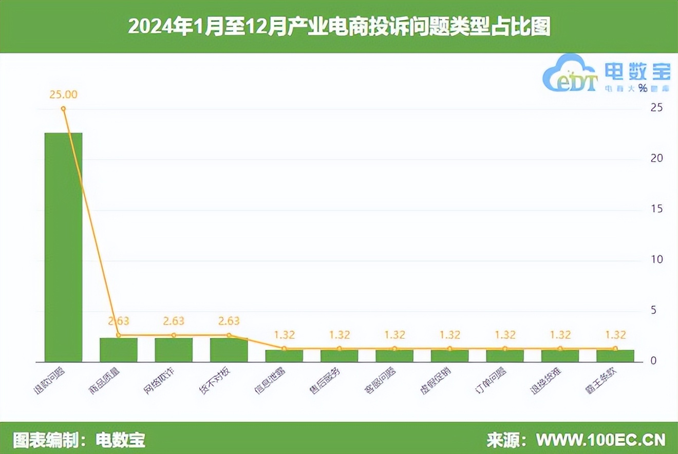 據“電訴寶”顯示,2024年全國產業電商用户投訴問題類型主要包括退款問題(25.00%)、商品質量(2.63%)、網絡欺詐(2.63%)、貨不對板(2.63%)、信息泄露(1.32%)、售後服務(1.32%)、客服問題(1.32%)、虛假促銷(1.32%)、訂單問題(1.32%)、退換貨難(1.32%)、霸王條款(1.32%)等。