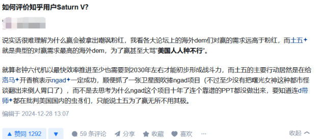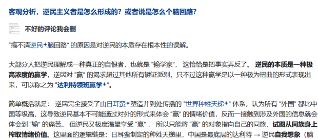 在“理性”思考徹底失效的情況下,知乎著名離岸民主黨人土星五號最終擁抱了“贏學”,憤憤不平地喊出了“人種不行”的結論。“贏學”迎來了自己的大爆發和流行,現在它成為了一切鍵政圈普遍採用的術語。