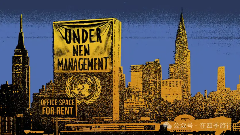 一幅描繪紐約市聯合國總部的插畫,畫面中有一面巨大的橫幅,上面寫着 “新管理團隊入駐”,還有一個牌子寫着 “辦公室空間出租”。整個場景以一種破舊、復古的色調呈現。Illustration: Ellie Foreman-Peck