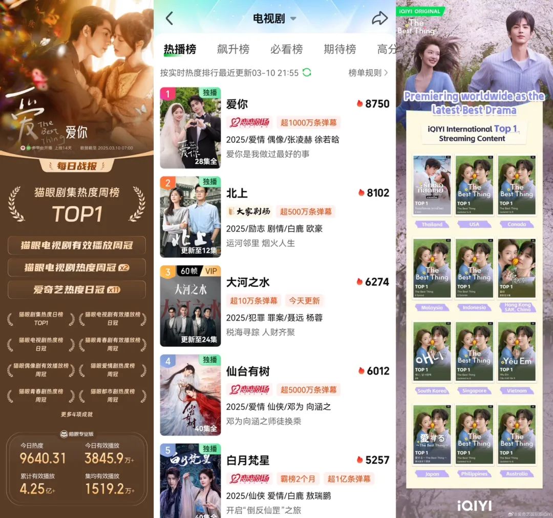 數據上,《愛你》愛奇藝站內熱度值一度突破8700,形成超1000萬彈幕的討論量;在海外,這部劇也接連登頂12個國家和地區的熱播榜TOP1,中醫何蘇葉與酒店經理沈惜凡正成為現偶界的“頂級魅魔”,用劇情、演技、佈景引發泰、韓等國網友的熱議。