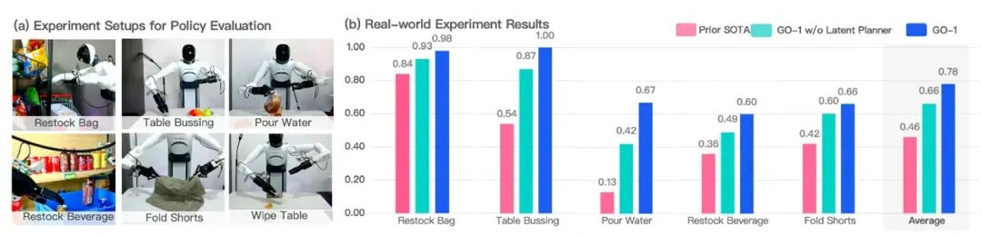 測試結果顯示,GO-1 的表現比之前模型已經提高了很多,但在倒水(Pour Water)、清理桌面(Table Bussing)和補充飲料(Restock Beverage)的成功率最高仍不到 80%。