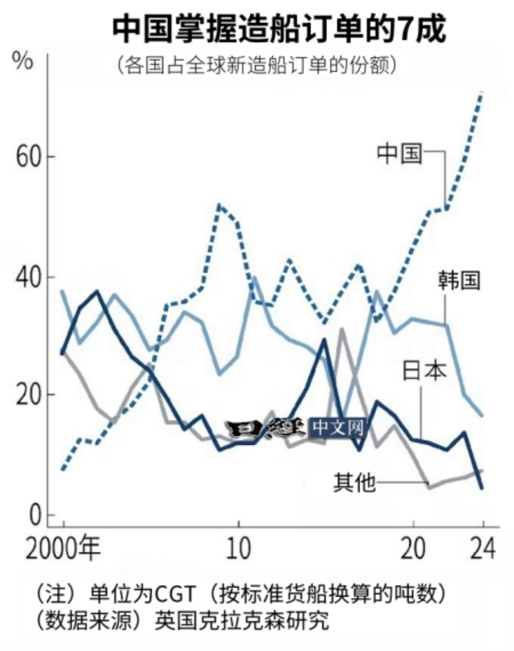中國工信部的數據顯示,2024年,中國造船業完工量達55.7%——2024年全球交付的船中,有一半以上是中國製造。