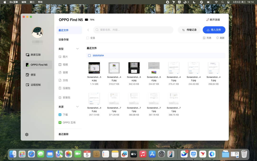 比如在 Mac 上安裝好 “ O+ 互聯 ” 登錄賬號並且配對上手機後,我們就可以直接在 Mac 查看、編輯與管理手機中的所有文件,而且只需拖拽文件就能實現互傳,包括便籤和筆記也能即時同步到兩個設備。