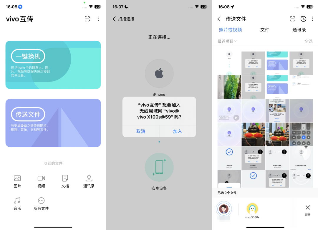 而 vivo 則是通過 “ 互傳 ” APP,它跟 “ O+ 互聯 ” 一樣,使用前不需要咱們登錄 vivo 賬號,但跨設備傳文件的時候,還是得在 APP 裏掃碼讓 iPhone 連上 vivo 手機的熱點。