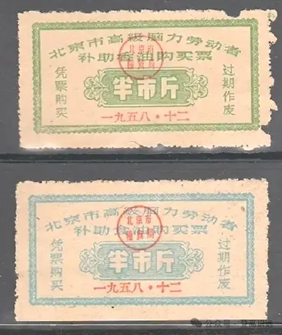 對高級腦力勞動者(高級知識分子)給予補助的香油、食油等,從1954年開始到1958年,直至1964年自然災害結束。