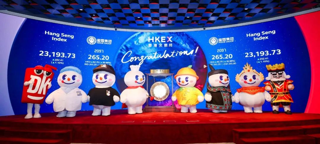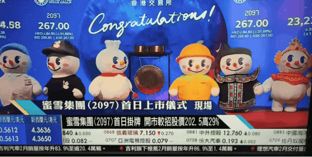 蜜雪冰城於2025年3月3日在香港交易所成功上市,上市首日,蜜雪冰城表現強勁,開盤價為262港元/股,較發行價202.50港元/股上漲29.38%,收盤價為290港元/股,漲幅達43.21%,首日總市值突破1000億港元。