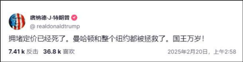 2月20日,他宣佈廢除徵收紐約的交通擁堵費,還自誇是“國王”。