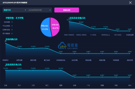2024年,用户投訴“支付寶”的問題類型主要集中於網絡欺詐、信息泄露、退款問題;“電訴寶”受理投訴用户聚集地區為雲南省、四川省、江蘇省、浙江省、福建省、安徽省、廣東省、新疆維吾爾自治區、河南省、湖北省;其中,女性用户投訴比例為46.67%、男性用户投訴比例為53.33%;用户投訴“支付寶”投訴金額分佈於5000-10000元、1000-5000元、0-100元、10000元以上、100-500元區間。