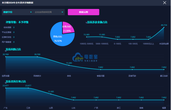 據“電數寶”顯示,2024年全年,“來分期”的問題類型主要集中於信息泄露、網絡欺詐、客服問題、惡意罰款、霸王條款;“電訴寶”受理投訴用户聚集地區為廣東省、江蘇省、山西省、山東省、廣西省、浙江省、湖南省、福建省;其中,女性用户投訴比例為23.08%、男性用户投訴比例為76.92%;用户投訴“來分期”投訴金額分佈於1000-5000元、5000-10000元、0-100元、100-500元、10000元以上區間。