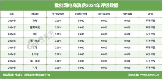據“電數寶”監測數據顯示,2024年“批批網”共獲得8次消費評級,均為“不予評級”,2024年整體消費評級為“不予評級”。