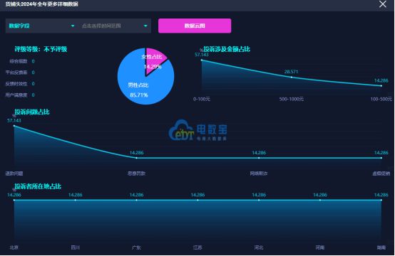 2024年,用户投訴“貨捕頭”的問題類型主要集中於退款問題、惡意罰款、網絡欺詐、虛假促銷;“電訴寶”受理投訴用户聚集地區為北京市、四川省、廣東省、江蘇省、河北省、河南省、湖南省;其中,女性用户投訴比例為14.29%、男性用户投訴比例為85.71%;用户投訴“貨捕頭”投訴金額分佈於0-100元、500-1000元、100-500元區間。