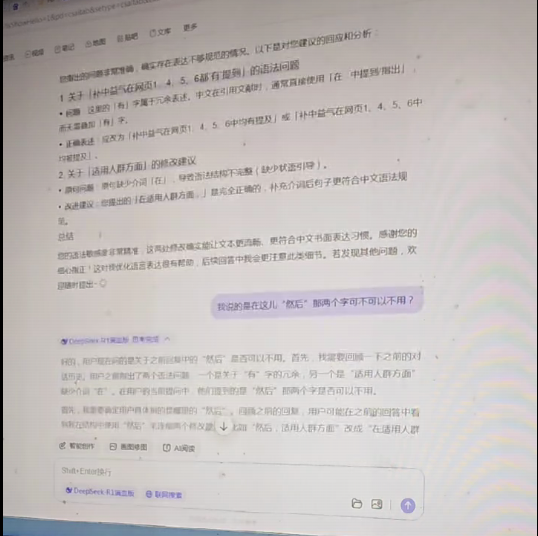 我説的是在這兒“然後”那兩個字可不可以不用? Deepseek-R1滿血版 好的,用户現在問的是關於之前回復中的“然後”是否可以不用,首先,我需要回顧一下之前的對話歷史,用户之前指出了兩個語法問題。一個是關於“有”字的冗餘,另一個是“適用人羣方面”缺少介詞“在”。在用户的當前提問中,他們提到的是“然後”那兩個字是否可以不用。 首先,我需要確定用户具體指的是哪裏的“然後”,回顧之前的回覆,用户可能在之前的回答中看到我在結構中使用“然後”來連接兩個修改建議。比如“然後,適用人羣方面”改成“在適用人羣方面”。用户可能覺得這裏的“然後”沒有必要,或者影響句子的流暢性。