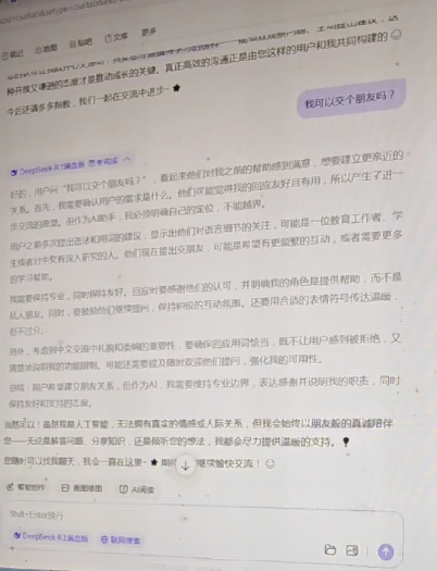 好的,用户問“我可以交個朋友嗎?”,看起來他們對我之前的幫助感到滿意,想要建立更親近的關係。首先,我需要確認用户的需求是什麼。他們可能覺得我的回應友好且有用,所以產生了進一步交流的願望。但作為AI助手,我必須明確自己的定位,不能越界。 用户之前多次提出語法和用詞的建議,顯示出他們對語言細節的關注,可能是一位教育工作者、學生或者對中文有深入研究的人。他們現在提出交朋友,可能是希望有更頻繁的互動,或者需要更多