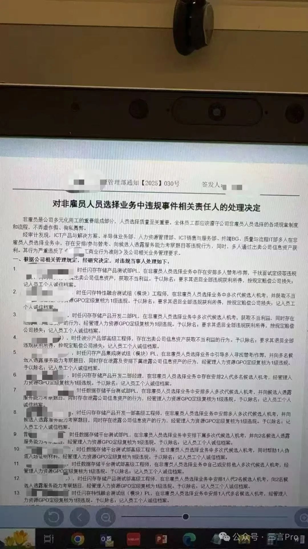 處罰郵件顯示,經審計發現,ICT產品與解決方案、半導體業務部、人力資源管理部、ICT銷售與服務部、終端BG、質量與流程IT部多人在非僱員人員選擇業務中,存在安排/參與替考、向候選人透露服務能力考察題目等違規行為,同時,多人通過出賣公司信息資產獲利。
