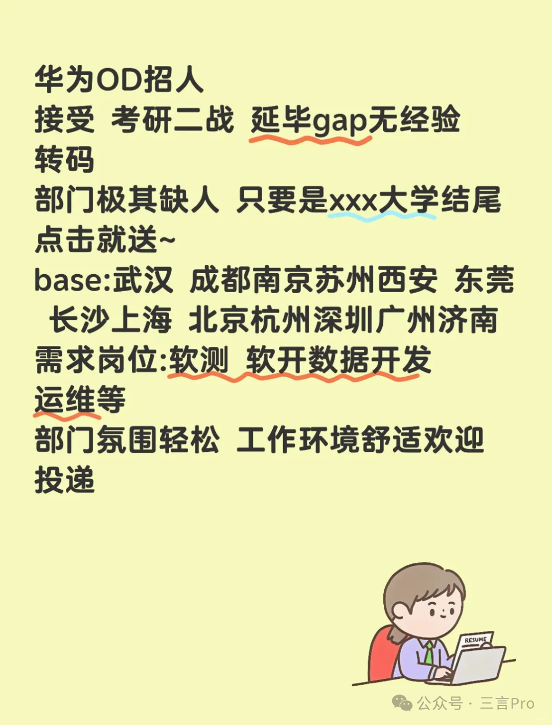 在社交平台上,今年2月份也有人發佈華為OD招聘,稱接受考研二戰、延畢無經驗,並表示部門極其缺人,只要是xxx大學結尾點擊就送。