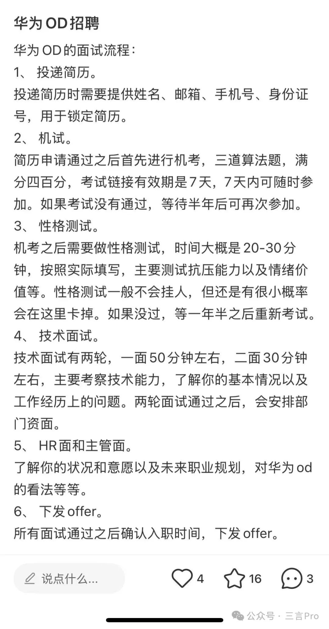 還詳細列出了華為OD招聘的全流程:投遞簡歷、機試、性格測試、技術面試、HR面和主管面、下發offer。