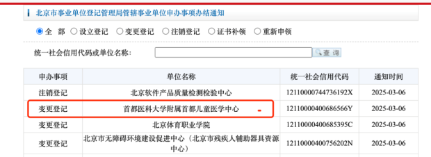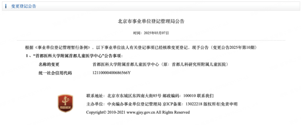 “醫學界”查閲發現,3月7日,北京市事業單位登記管理局網站發佈“變更登記公告”,已經核准變更登記,名稱的變更:首都醫科大學附屬首都兒童醫學中心(原:首都兒科研究所附屬兒童醫院)。