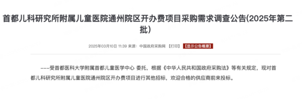 根據“中國政府採購網”3月10日公告,通州院區開辦費項目目前正進行招標,採購單位名稱為“首都醫科大學附屬首都兒童醫學中心”。