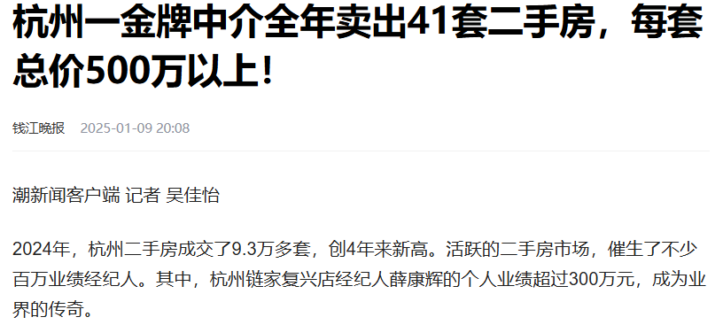 前兩個月,《錢江晚報》報道了杭州一位姓薛的金牌中介,2024年賣出了41套二手房。