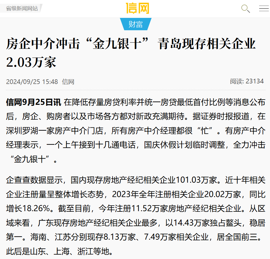 斯基查了一下,2024年整個青島交易了大概14.5萬套新房、二手房,而青島當地房產經紀相關的企業是2.03萬家。