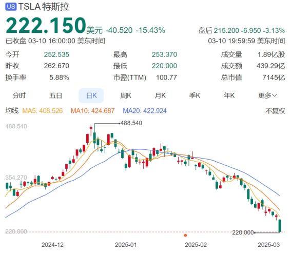 本週一美股交易中,特斯拉股價大跌逾15%,創下2020年9月以來的最大單日跌幅;收盤報於222.15美元,相比去年12月17日的479.86美元歷史高點下跌超50%。