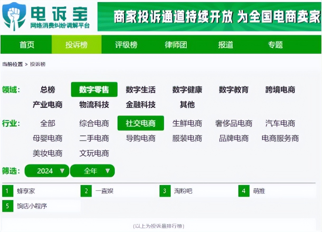 根據“電訴寶”2024年受理的中國社交電商領域用户有效投訴顯示,入選投訴榜的依次為:蜂享家、一直娛、淘粉吧、萌推、餉店小程序。此前,雲集、愛庫存APP、全民嚴選、達令家、斑馬會員、nice、斑馬會員、甩甩買、實惠喵等社交電商平台也遭遇過類似投訴。