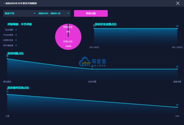 據網經社旗下電商大數據庫“電數寶”監測數據顯示,2024年“一直娛”共獲得6次消費評級,均為“不予評級”,2024年整體消費評級為“不予評級”。2024年“一直娛”涉嫌存在發貨問題、退換貨難等問題。用户投訴“一直娛”的消費金額主要在100-500元區間。