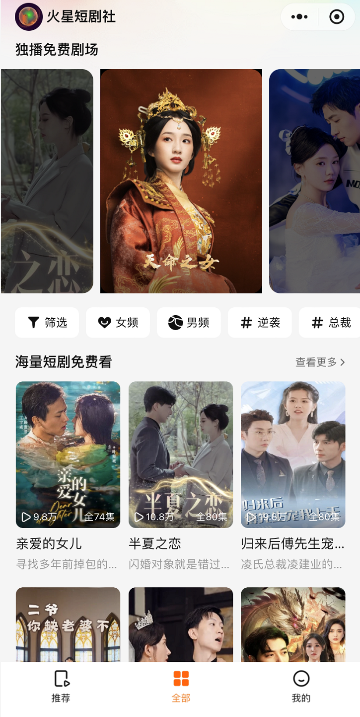 看向未來,這樣龐大的用户羣指向了一個持續爆發的市場,而着眼於當下,置身於這一波高潮,行業需要更加清晰地將短劇視作一種獨立的內容業態,在這之中,紅果短劇成為這波高潮的引領者和受益者。但賽道蛋糕的分割才剛剛開始,最新的動作是,騰訊於近日推出“火星短劇社”小程序,用户只需觀看廣告即可免費解鎖相應的短劇內容。作為其上線的首個獨立的短劇產品,這一舉動也可以被視為長視頻平台打響“反擊戰”的重要信號。