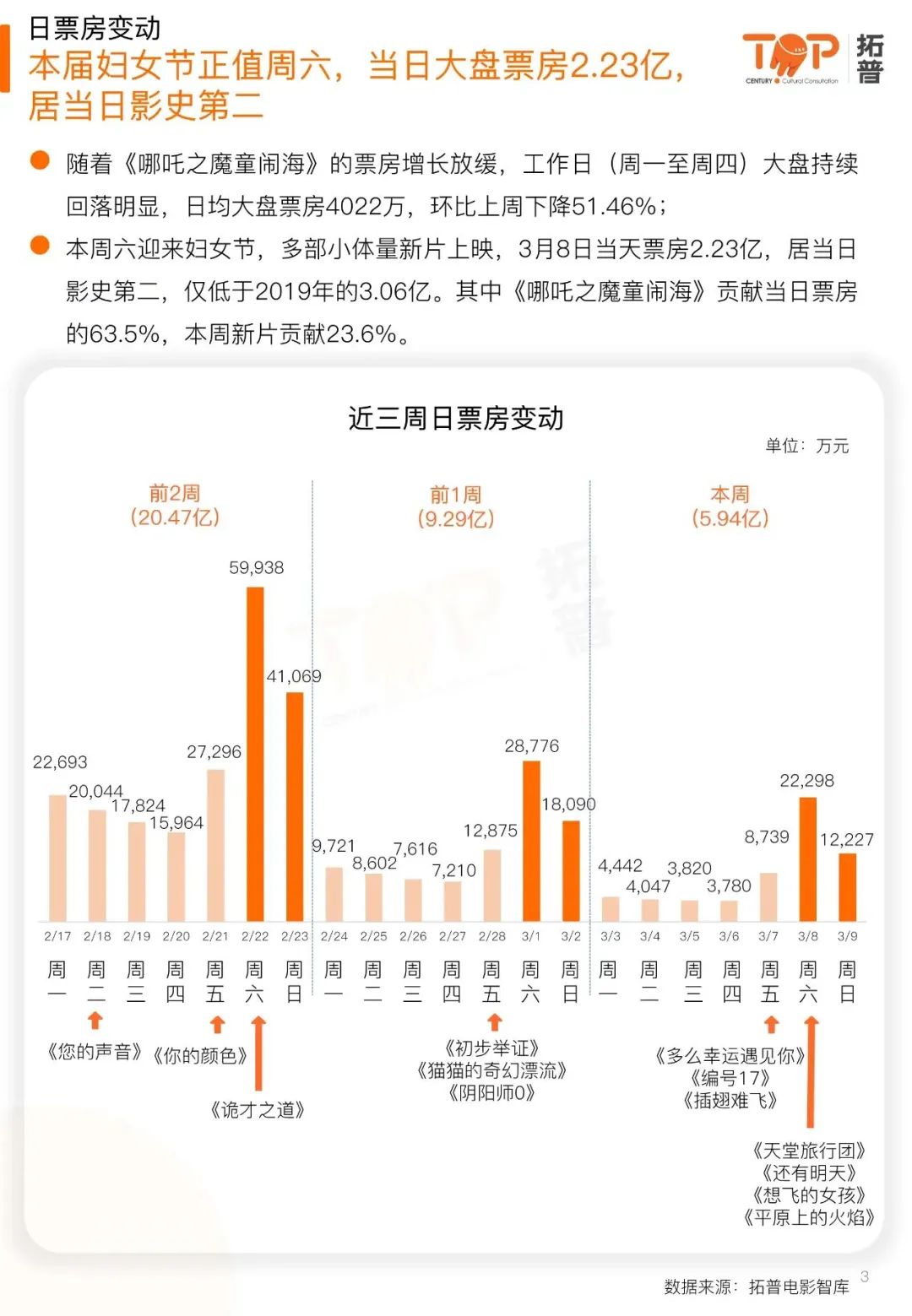 總票房看上去是在破紀錄,但一片獨大,即便上映新片看似不少,也沒有出現像去年《周處除三害》一樣的黑馬繼續帶動大盤,雖然婦女節檔小週末獲得了比預期好的成績,但整體依舊量級太小。
