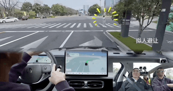行人和電動車同時出現在轉彎路口,但B10搭載的智駕系統剎車減速過程平緩順滑,車內乘客沒有絲毫“前俯後仰”。