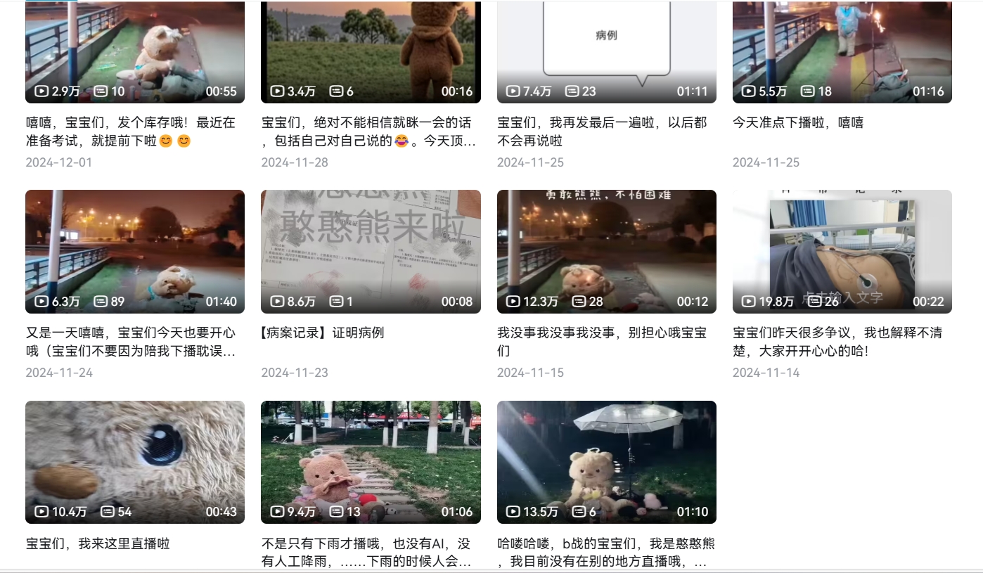 而看了一些up主的自我介紹和網友的説明,瞭解到24年5/6月起up主是在抖音直播的,後來b站有不少盜播的,最終轉移到b站直播;同時還有和一位“同質up主-屁屁熊來了”的battle(看評論等信息,應該是“屁屁熊來了”更有問題吧,涉及到流量利益和所謂創意問題,現在憨憨熊的流量和口碑已明顯高於對方);而且似乎憨憨熊的抖音賬號被封禁了,目前只有一個小號在做直播,但人氣很低,重點就是在b站了。