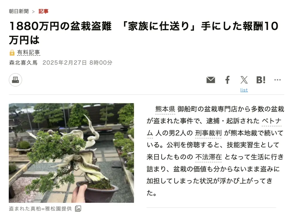 該新聞報道了發生在九州熊本御船町的盆栽盜竊案,當時共有33棵盆景被盜,損失達1880萬日元。實施一線盜竊的是2名越南技能實習生,他們在2025年2月27日被分別判處有期徒刑5年和8年(其中一位因為種植毒品被數罪併罰)有期徒刑。