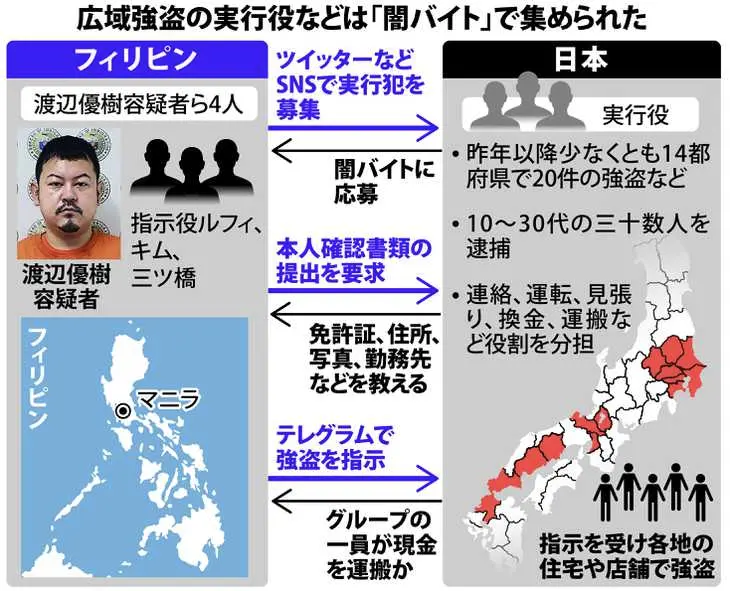 所謂暗黑打工,就是日本犯罪集團使用高額招聘廣告,招募弱勢羣體作為犯罪耗材。達成意向後,通過telegram這樣的加密App佈置犯罪計劃,然後犯罪首腦通過電話,遠程指揮招募到的犯罪者實施犯罪,並完成劫掠,分成。2022年5月到2023年2月間,日本14個都府縣發生的數十起“広域強盜事件”都是通過這樣招募到的“執行人”。