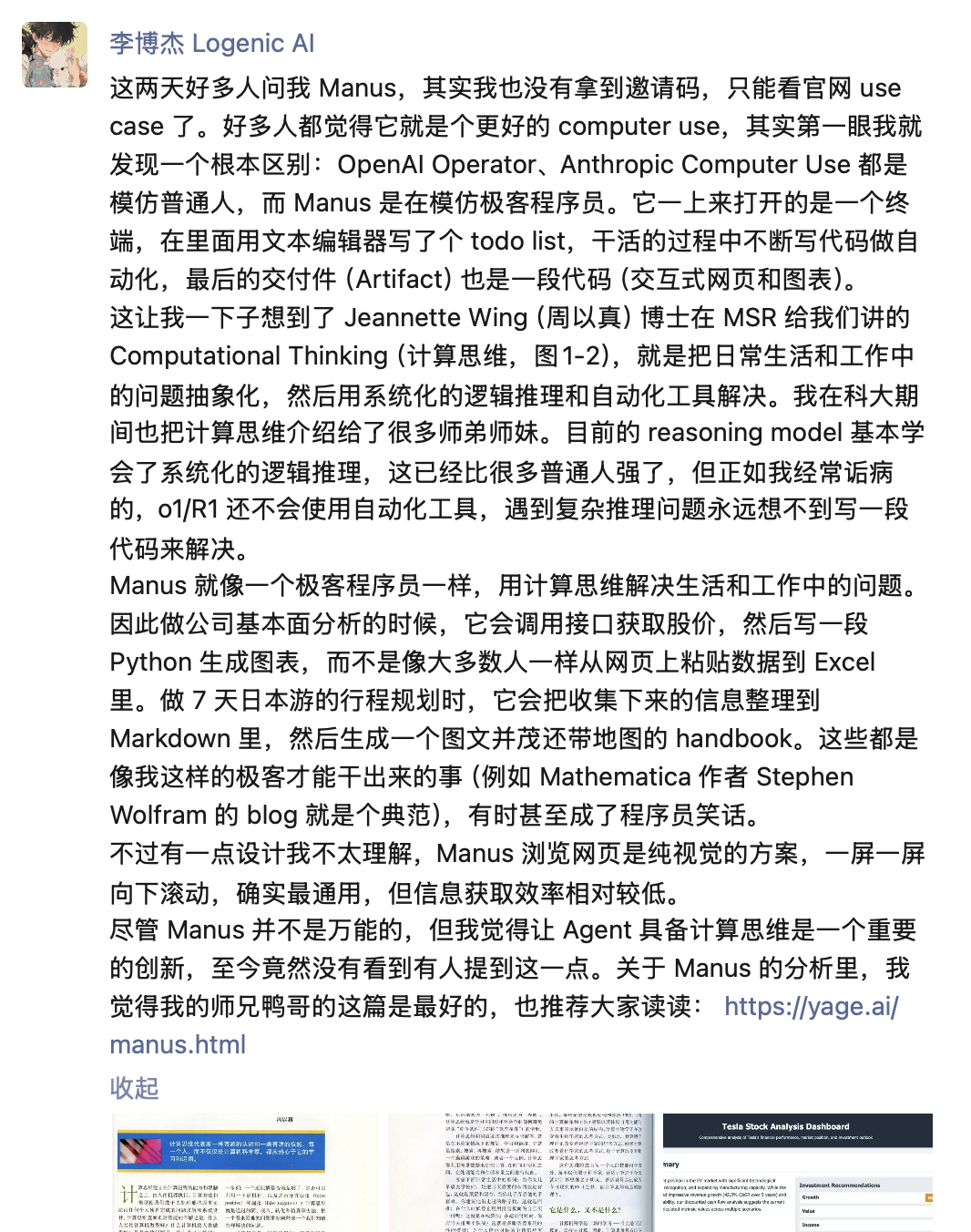 華為天才少年、Logenic AI 創始人李博傑認為 Manus 有一眼不同於其他產品的厲害之處:以極客程序員的方式解決問題。|圖片來源:微信截圖
