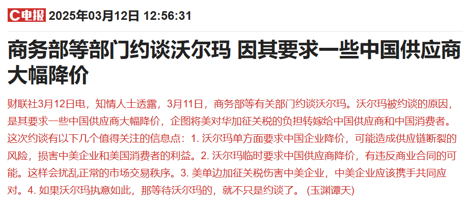 為什麼中國政府第一時間就約談沃爾瑪了?因為這太不公平了。沃爾瑪的這種行為,不只是損害了中國供應商的利益,還阻礙了中國人民對幸福生活的追求。而且,沃爾瑪是美國最大的零售集團。沃爾瑪的商品價格,能直接反映美國的物價指數。憑什麼中國人拼命幹活,美國人歲月靜好?這種單方面壓榨中國人,來伺候美國人的生意,不是極度不公平的。
