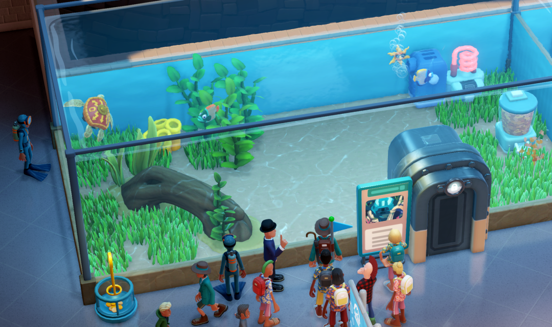 **海洋生物博物館,**則是釣佬狂喜的關卡,你需要學習怎麼搭建水族箱,把不同的魚養在一起,既能符合它們的日常習性,又能讓熱議度最大化( 熱議度大,來看的人就多 )。